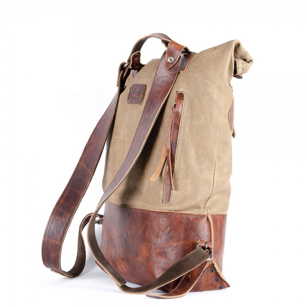 Canvas acabado vintage, colores negro, caqui, olivo y gris oxford. Piel 100% Bovino. Forro 100% algodón. Herraje Metálico reforzado y cierre ykk.