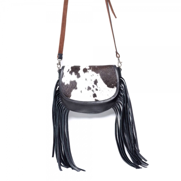 Piel 100% Bovino. Forro Poliester/Algodón. Herraje Metálico reforzado y cierre ykk. Aplicación tira pelo de vaca. Piel Flor entera.