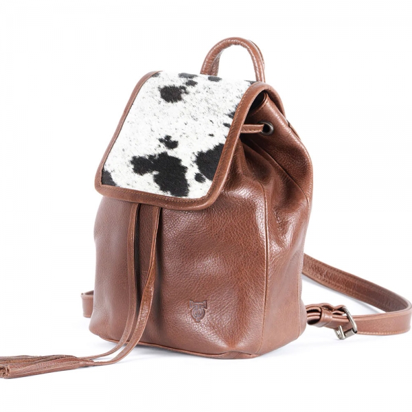 Piel 100% Bovino. Forro Poliester/Algodón. Herraje Metálico reforzado y cierre ykk. Aplicación frente pelo de vaca. Piel Flor entera.