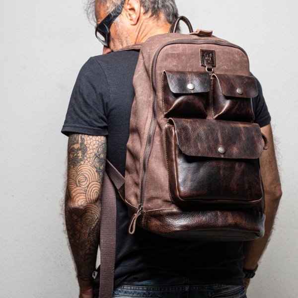 Canvas acabado vintage, colores negro, ladrillo, caqui, olivo y gris oxford. Piel 100% Bovino. Forro 100% algodón. Herraje Metálico reforzado y cierre ykk.