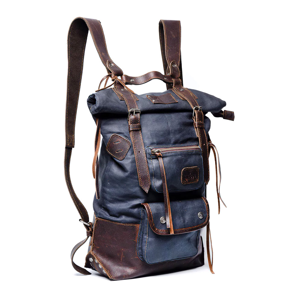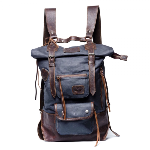 Canvas acabado vintage, colores negro, caqui, marino, olivo y gris oxford. Piel 100% Bovino. Forro 100% algodón. Herraje Metálico reforzado y cierre ykk. Piel Crazy.